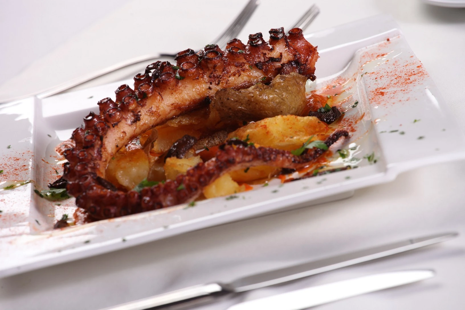 Para el Armado del plato hay que colocar la salsa romesco pintando el plato, agregar las papas crujientes con sal marina, poner el tentáculo de pulpo bien dorado, completar con olivas griegas, una brizna de pimentón español, perejil picado y un hilo fino de un excelente aceite de oliva.